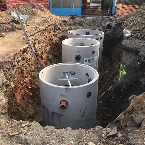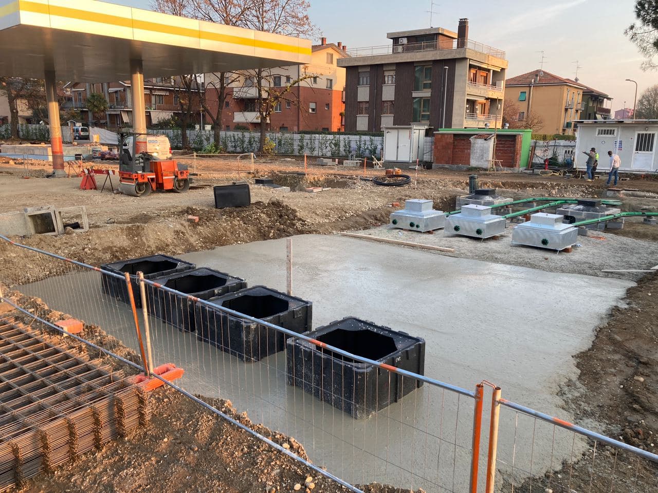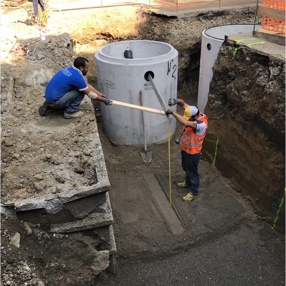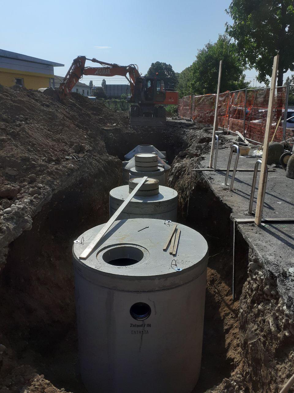 - Così facendo si evita il sovraccarico delle fognature (specialmente se si tratta di reti miste) che, durante le giornate di pioggia, non ricevono la quota parte delle prime piogge provenienti dalle superfici impermeabili trattate con questa tipologia di impianto. Ci occupiamo quindi di opere di adeguamento dell'impianto di scarico acque reflue sulle aree di servizio carburanti, grazie all'impiego di grossi mezzi e all'installazione dell'impianto prime piogge con pozzi e vasche di depurazione.